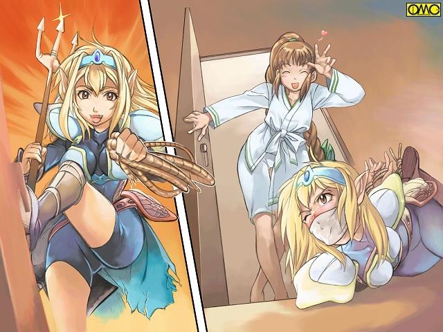 南洋っぽい島が広がる世界で、治安維持を担う海の騎士の女性が、問題を起こした女性格闘家を捕縛しようと乗り込んだものの、返り討ちにあって縛り上げられ、逃げられてしまう、というシーンです。